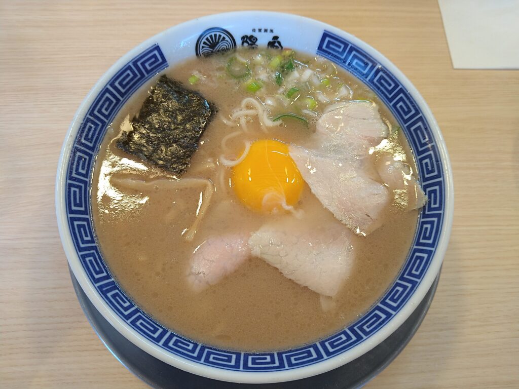 久しぶりに健軍の2号店に来訪。床がツルツルとしていて町中華のような感じと思いつつ券売機で今回は玉子入りラーメンをオーダー。麺は細麺ストレートで喉越しの良いタイプ。佐賀らーめんの特徴である野性的な呼び戻しスープはとんこつの旨味が凝縮されていて美味い。トッピング具材は薄目のチャーシュー3枚、ネギ、メンマ、のり、中央に卵黄という構成。まずはスープを一口すすり、麺を半分ほど一気に食べる。そのあとは卵黄をレンゲに乗せ、麺を絡めてすき焼きのようにして食べる。箸休めのチャーシューは薄いながらもしっかりとした味付けとなっている。最後は卓上の辛子高菜やにんにくとうがらしを投入し味変を楽しみながら完食となった。