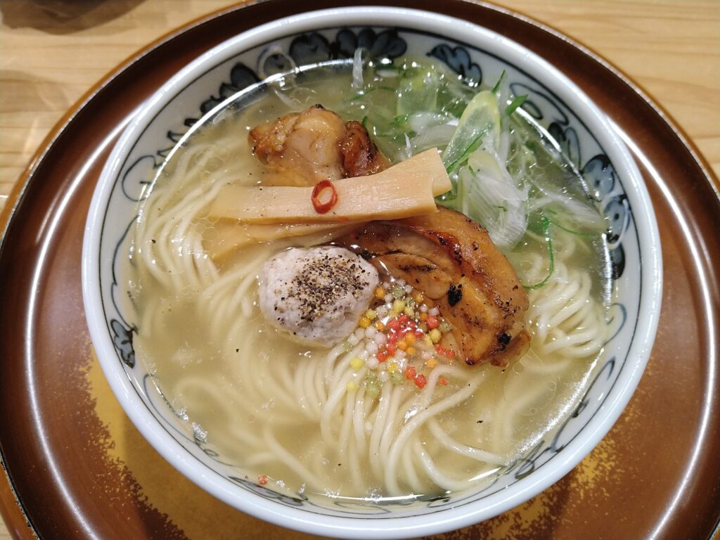 最近増えてきたモバイルオーダーにて看板メニューのこだわり塩麺をオーダー。店内にはおしゃれなBGMが流れており、リラックスして待つことしばし、おしゃれなラーメンが着丼。スープはあっさりの中にも深みを感じる塩味に仕上がっており薬膳スープのようでもある。麺は、選べる三種類の太さの中から中太麺を選択。ツルツルとした食感でスープにマッチしている。トッピング具材は長ネギ、メンマ、つくね、てりやき風の鶏肉チャーシュー、そこに彩りの良いアラレが添えられている。全体的に上品なラーメンで女性のお客さんが多いのもうなずける。麺、スープ、トッピングの全てにおいてレベルが高く、まさに絶品と言える1杯だった。