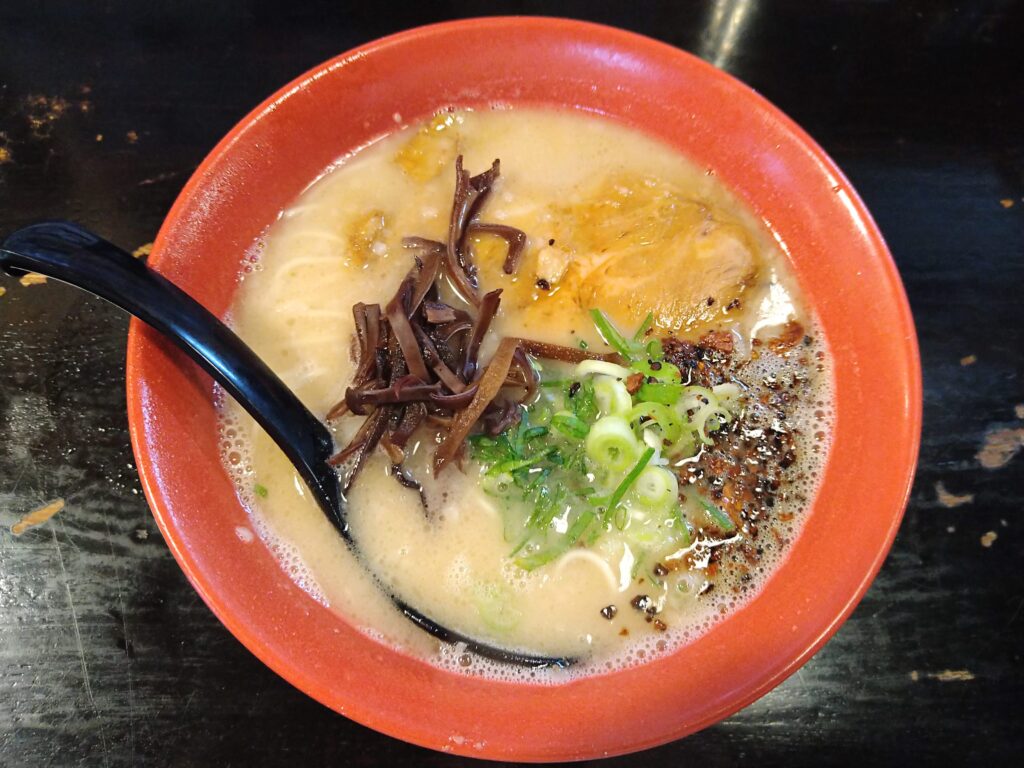 最近ビュッフェメニューが無くなり話題となった天心に初訪。入口の券売機が故障中とのことでカウンターにて天心ラーメンをオーダー。麺は細麺のストレートで軟らかめの茹で加減。スープは豚骨の旨味が濃縮されていてコッテリとしている。トッピング具材はキクラゲ、ネギ、そして大きなチャーシューが1枚。スープに浮いている焦がしニンニク油が甘みのある豚骨スープにマッチして良い。半分を食べ終えたところでは無料サービスの紅しょうがと辛味噌を加え味変を楽しみながら完食。ガツンとした食べ応えのあるラーメンで大満足の一杯だった。なお、コッテリしすぎて床がツルツルとしているので足元にはくれぐれもご注意を。