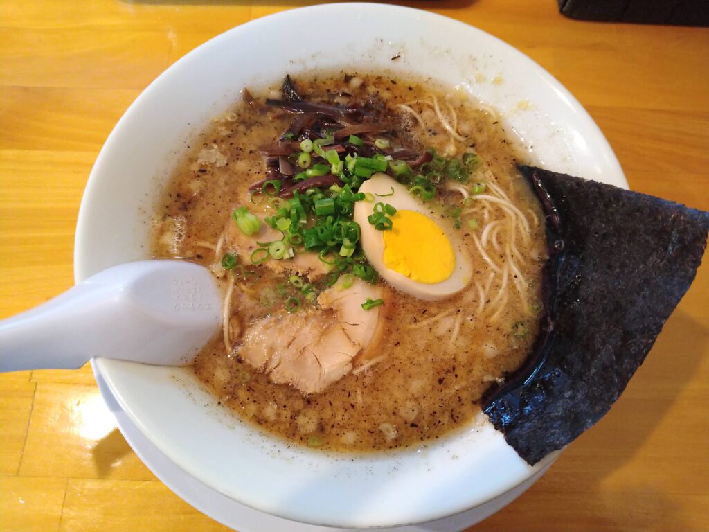 熊本大学医学部にほど近い場所にある名店。ラーメンもチャーハンも旨いと評判のこの店で今回はこってりらーめんをオーダー。カウンターには感染症対策で隣席との仕切りがあり安心してラーメンを楽しむことができる。オーダーして間もなく過去最速でラーメンが着丼。麺はストレートの極細麺で小麦の風味が感じられて旨い。背脂と焦がしニンニク油が浮いたスープはまさにこってりで、ニンニクの風味と塩気のバランスがよくガツンとした仕上がり。トッピング具材はチャーシュー1枚、ネギ、きくらげ、味玉1/2、海苔という構成。チャーシューは肉厚だがホロホロ系で良く煮込まれている。このラーメンは進化系熊本ラーメンという感じで総合的にトップクラスの旨さだと思う。なお、カウンターから厨房で調理している様子が見えるのだが、手際良く鍋を振って作られているチャーハンがとても旨そうだった。