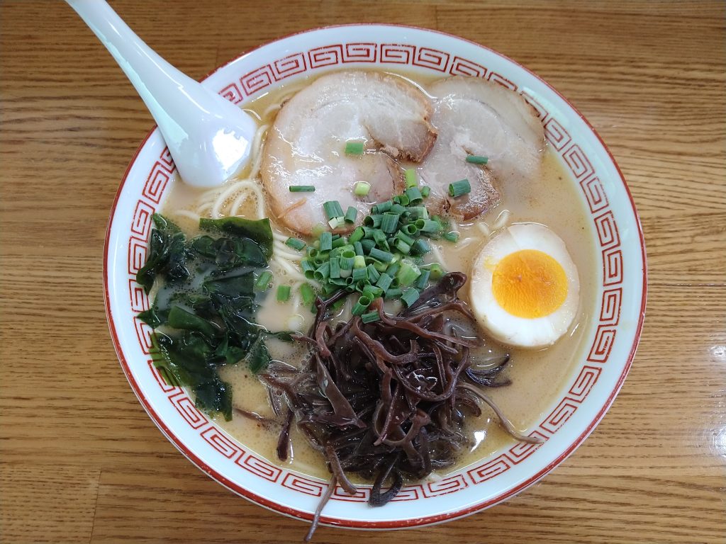 熊本県道1号線沿い金峰山麓にあるラーメン横道に初訪。今回は基本のラーメンをオーダー。ストレートの麺は普通の太さでモチっとした食感。スープは甘みのあるトンコツでクリーミーな味わい。トッピング具材はチャーシュー2枚、青ネギ、きくらげ、煮玉子1/2,ワカメといった構成。ラーメンのトッピングにワカメとは珍しい。麺の量が一般的なラーメンよりも多くて食べ応えがあり、スープが若干ぬるめのため猫舌の人でも食べやすいラーメンに仕上がっている。ドライブやツーリングの途中に立ち寄れるドライブイン的な雰囲気のある居心地の良いラーメン店であった。