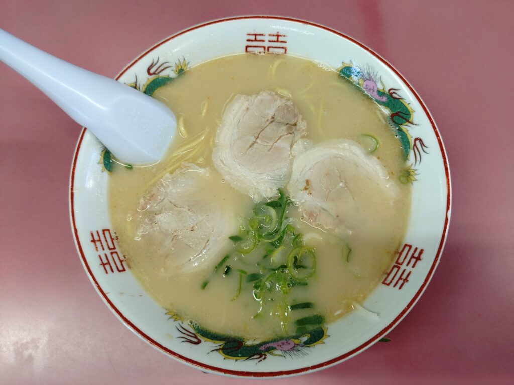 JR荒尾駅にほど近い場所に昔から店舗を構える老舗ラーメン店「ふじや」に初訪。到着時はちょうど満席のため店外で待機となったが数分後にはカウンターに着席。初訪なのでノーマルにラーメンをオーダー。カウンターからは厨房が丸見えで調理の行程が全て確認できて安心感がある。着丼したラーメンの麺は中細のストレートでやや黄色い感じ。スープは白濁した豚骨スープで久留米ラーメンに近い感じのワイルドさがある。トッピングはチャーシュー3枚にネギのみといったシンプルな構成。チャーシューは薄いが3枚も乗っていてうれしい。昔ながらのとんこつラーメンであっさりと食べられる一杯だった。