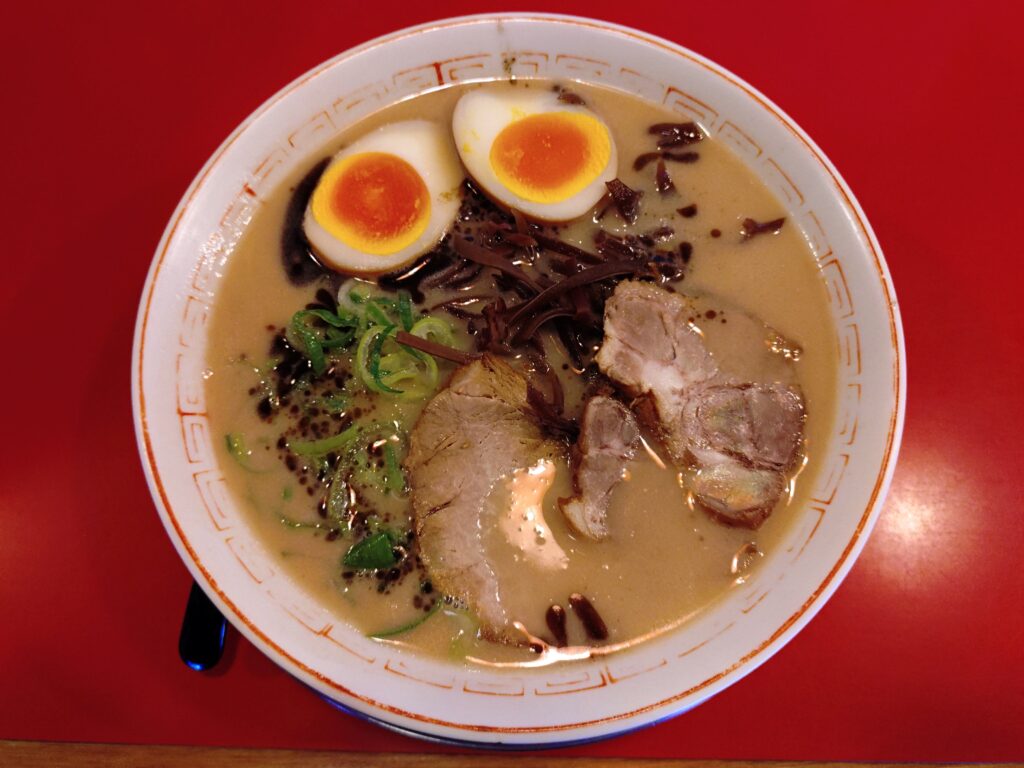 熊本のおしゃれストリート上之裏通りにある赤組に久しぶりの訪問。若いお客さんが多く外国人の方にも人気の店だ。ここはカレーラーメンも人気なのだが今回は味玉ラーメンをオーダー。着丼したラーメンの麺は極細のストレートで柔らかめの湯で加減。博多ラーメンの麺のように小麦が香る。スープは黒マー油が浮いた茶褐色の濃厚豚骨スープでパンチが効いている。トッピングはチャーシュー3枚、ネギ、キクラゲに味玉といった構成。チャーシューはホロホロとした食感で3枚も乗っていて嬉しい。味玉も濃厚スープに負けない濃い目の味付けでウマい。このラーメンが750円で食べられるという驚きのコスパの良さに感動。熊本ラーメンの完成形とも言える伝統と進化を兼ね備えた一杯だった。