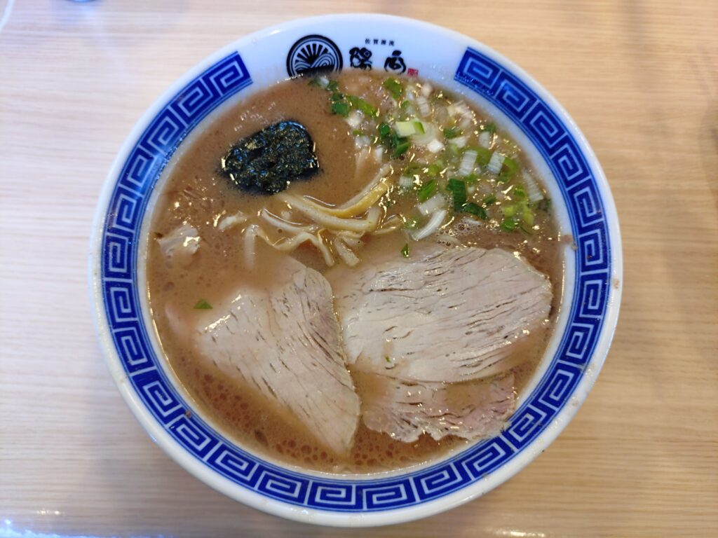 佐賀源流陽向第二章健軍店に久しぶりの訪問。駐車場が近接地に増設されていて満車の心配が解消されていた。久しぶりの今回はノーマルなラーメンを券売機で購入。カウンター越しに店員さんがラーメンを作る過程を見ることができて安心感がある。着丼したラーメンの麺は細麺ストレートで柔らかめの湯で加減。スープは呼び戻しスープで旨味が凝縮されたとんこつスープで塩気が効いている。トッピングはチャーシュー2枚、ネギ、メンマ、ノリといったシンプルな構成。チャーシューは肉感を味わうタイプでしっかりとした食感。無料サービスの辛子高菜や紅ショウガを途中で追加して味変も楽しめる。若いスタッフが元気よく作るラーメンはパワフルさとワイルドさを兼ね備えた満足の一杯だった。