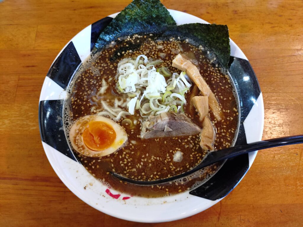 熊本東バイパスの近見交差点付近にあるつけ麺おんのじに久しぶりの訪問。つけ麺で有名なおんのじだが今回は未食のラーメンを券売機で購入。ネギの量を選べるとのアナウンスだが今回は普通でオーダー。着丼したラーメンの麺は中太の縮れ麺でモチモチとした食感。店内の製麺機で作っているようで自家製麺とのこと。スープは魚介の風味が強めの魚介豚骨で表面にはゴマが多めに浮いている。トッピングはチャーシュー1枚、メンマ、ネギ、煮玉子1/2、ノリ2枚といった構成。チャーシューは分厚くカットされておりホロホロ系で味は薄めに仕上がっている。全体的につけ麺をラーメンに仕立てた感じ。食後も魚介の風味がしばらく口の中に残るほど強烈な節系の一杯だった。